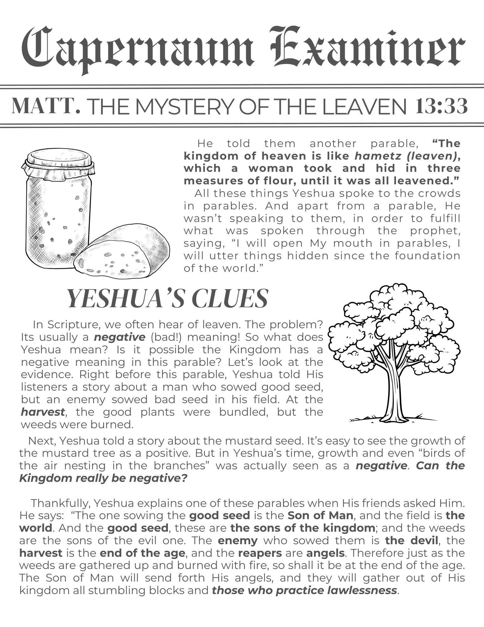 So that we can begin a new lump after Passover. So when Jesus teaches the parable of the leaven, He reminds us that the leaven of insincerity and wickedness will one day be completely removed from this Earth, making way for a new, pure loafβsymbolizing the resurrection and renewal in the coming Kingdom of God. Mind blowing! I bet you've never heard the parable of the leaven quite like this beforeπ©π»βπ³