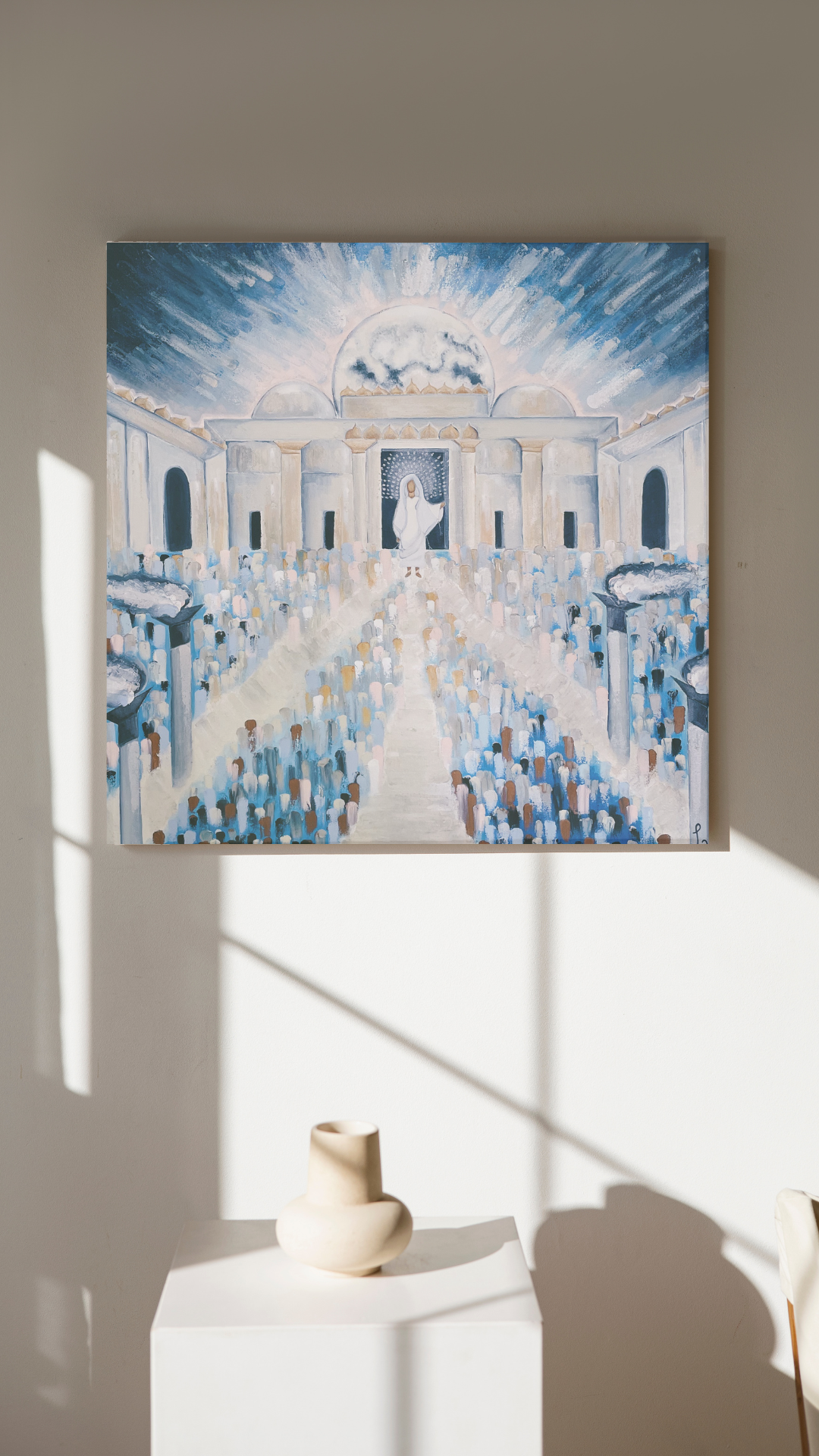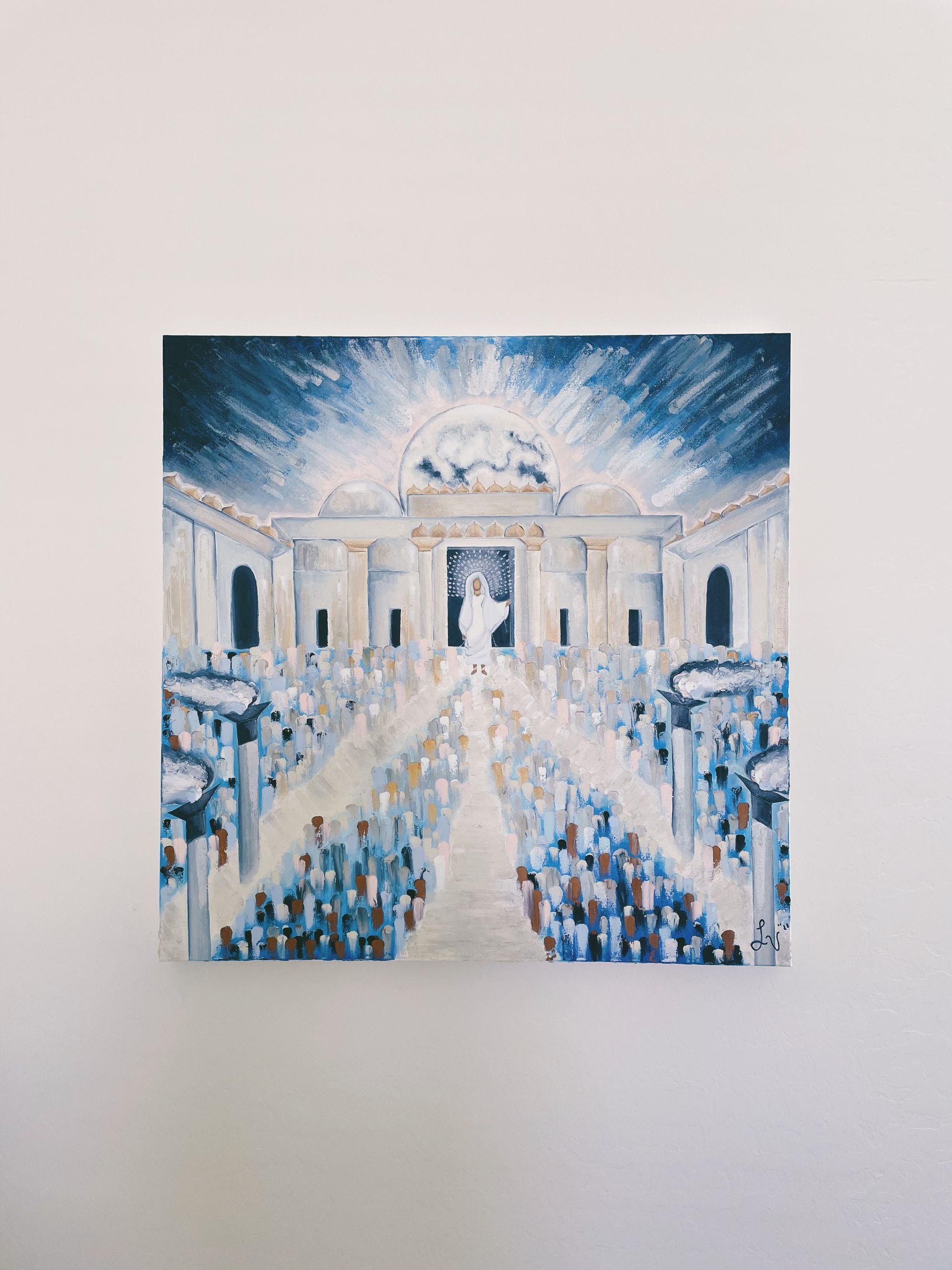 When Yeshua came to the temple in Jerusalem during the feast of sukkot, he was the Light of God standing in the Holy Place. Through this painting I have tried to visually depict this festive event in the Gospel of John.